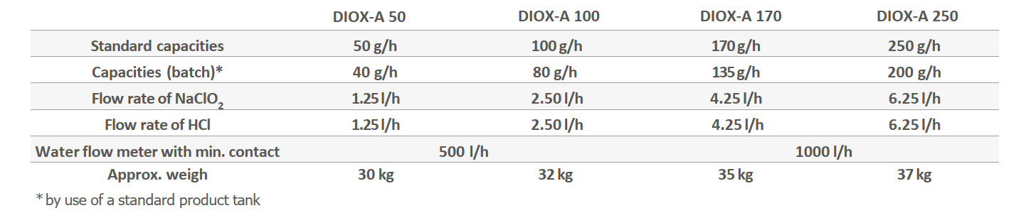 DIOX-A 二氧化氯產生器是可靠性的代名詞,結合了高安全性能、耐用性、操作簡單與低維護等優勢。該系統可穩定產出濃度高達 250 克/小時的二氧化氯水溶液。此產生過程使用 9% 的鹽酸與 7.5% 的亞氯酸鈉,兩種基本藥劑的配比經過平衡設計,可確保二氧化氯的最佳產率。